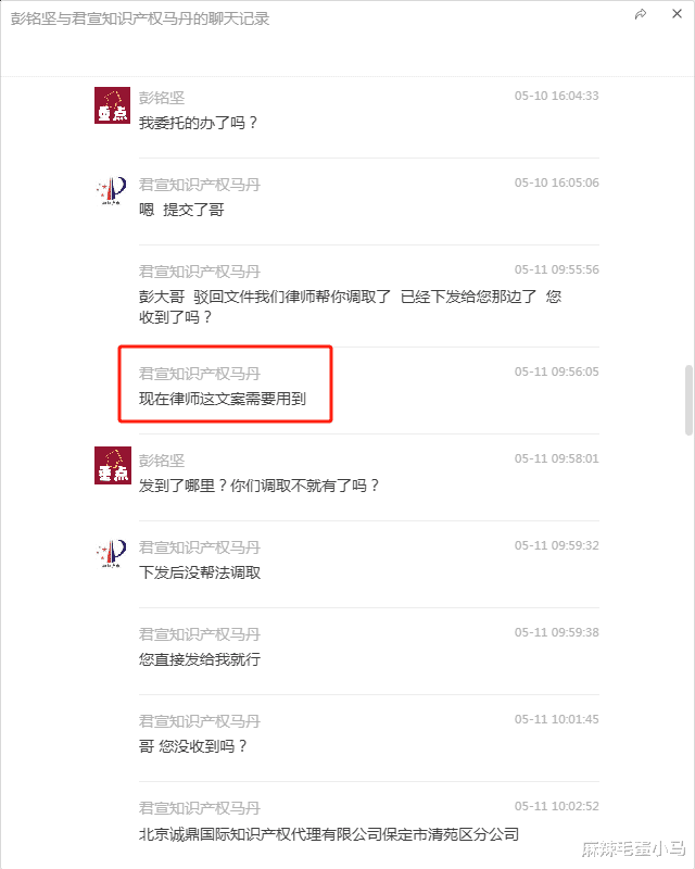 2.核心服务“隐身”,律师成“传说”:在整个沟通中,所有关于案件进展、法律需求(如调取驳回文件)的沟通均由业务员“马丹/王天泽”一人完成。彭先生多次询问律师的意见或希望直接与律师沟通,均未实现。业务员声称律师已调取并下发了驳回文件,却反过来要求彭先生提供该文件,逻辑矛盾,令人费解。