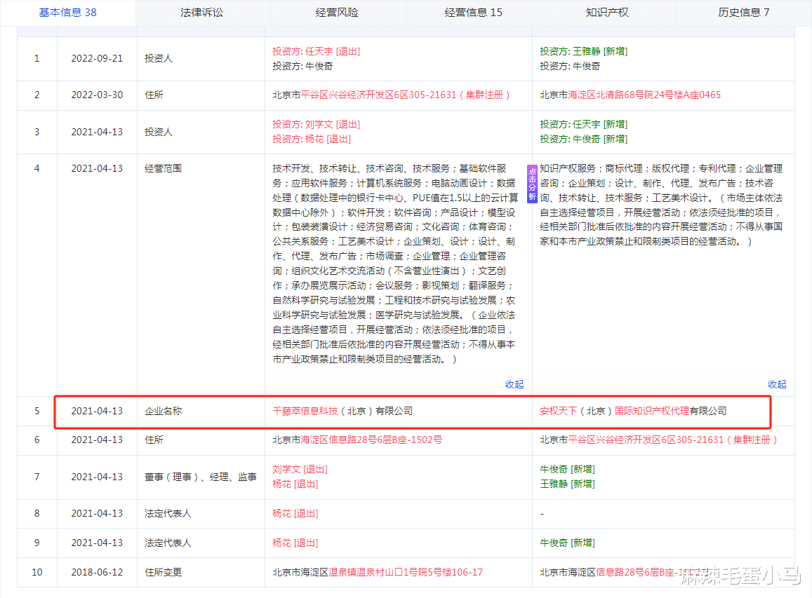 3.信息混乱,资质存疑:彭先生事后查询安权天下的工商信息发现,该公司在2021年曾进行名称、住所、法定代表人及投资人的系列变更,由“千藤萃信息科技(北京)有限公司”变更为现名。最新地址(北京市海淀区北清路68号院24号楼A座0465)与合同所盖公章地址(0466)存在细微差异。业务员宣称的“有自己独立律所”的说法,在现有公开信息及合同中也无法得到印证。