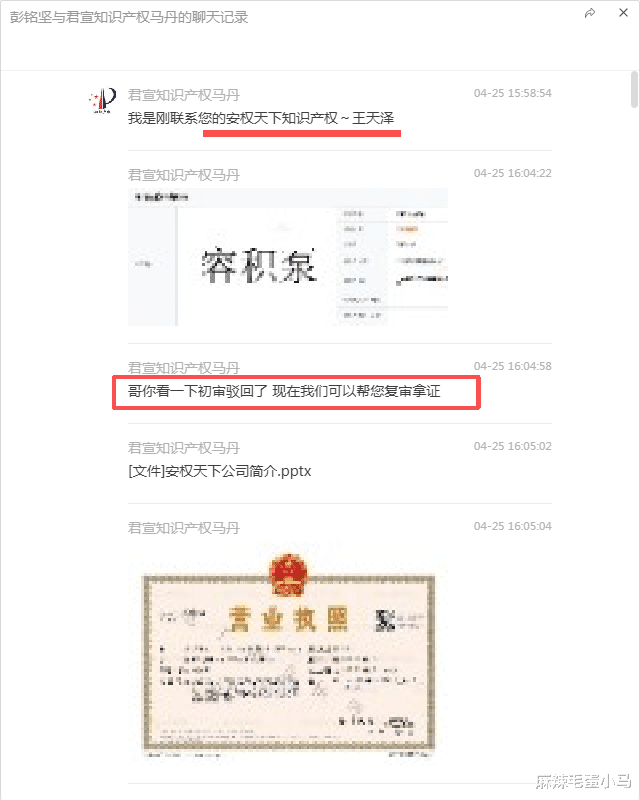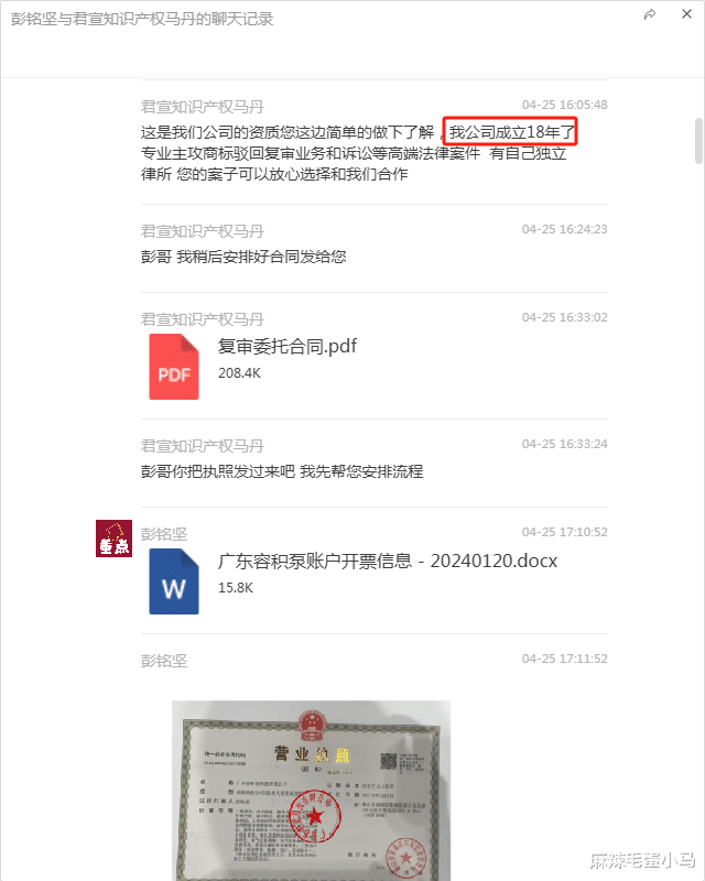 2024年4月25日,彭先生因其“容积泵”商标(第7类)注册申请被初步驳回,通过微信联系人“君宣知识产权马丹”(实为“安权天下”业务员王天泽)接洽。对方热情介绍了安权天下公司“成立18年”、“主攻商标驳回复审和诉讼等高端法律案件”、“有自己独立律所”等背景,并承诺“您的案子可以放心选择和我们合作”。