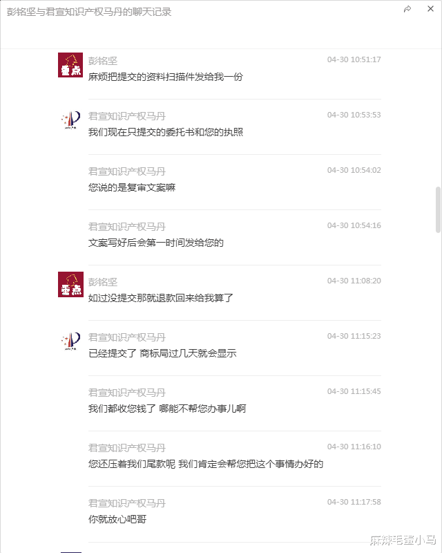 1.流程草率,回避材料:支付次日,业务员仅要求彭先生提供了营业执照和签署了一份委托书,便声称“已经提交了商标局”。当彭先生要求查看提交的完整资料(特别是复审的法律意见书“文案”)时,对方以“文案写好后会第一时间发给您”为由推脱。