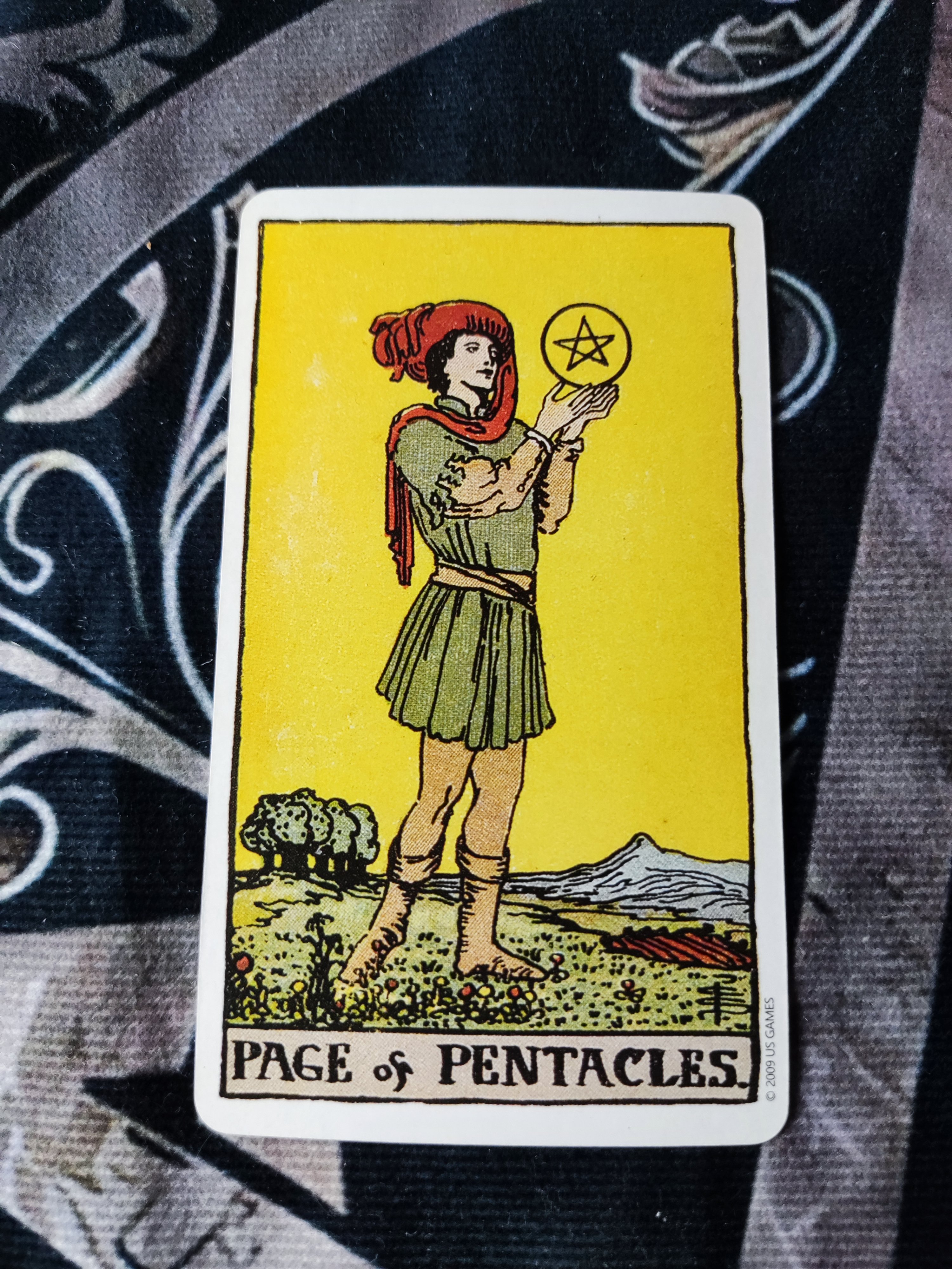 【故事与简单牌义】星币侍从描绘一位黑衣少年立于丰饶田野,双手虔诚托举星币凝视,红色帽檐下目光专注。瑞秋·波拉克在《78度的智慧》中强调这是"土元素最纯粹的学徒形态",体现"将知识转化为物质成果的务实精神"。水木老师在《愚人之旅:塔罗的邀请》解析其绿色外衣象征"生命能量与自然智慧的联结",而低头姿态暗示"谦逊是成长的起点"。丹尼尔在《塔罗逆位精解》指出正位时呈现"系统性学习的复利效应",逆位则沦为"用战术勤奋掩盖战略懒惰的假性努力"。
