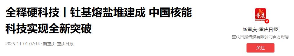 我国钍基熔盐堆技术的突破,彻底扭转了能源资源被动局面,开启了第四代核能时代。