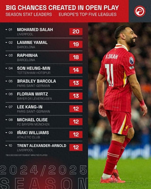 直播吧2月27日讯 数据媒体Squawka统计了五大联赛本赛季运动战创造绝佳机会次数榜单,萨拉赫20次排名第一,巴萨的亚马尔和拉菲尼亚排名第二和第三。