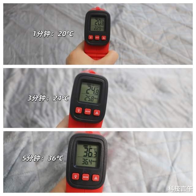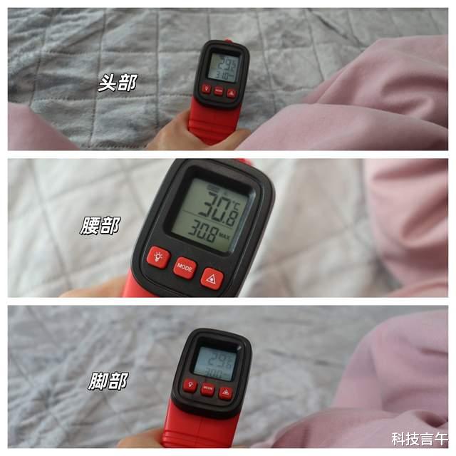 另外,我还发现它的温度也很均匀,不用太担心会受热不均。像我用红外枪测了一下毯面的相对应头部、腰部、脚部,温度都差不多,这样也就意味着我们用着会非常舒服,最起码不会一下子这冷,一下子这热。