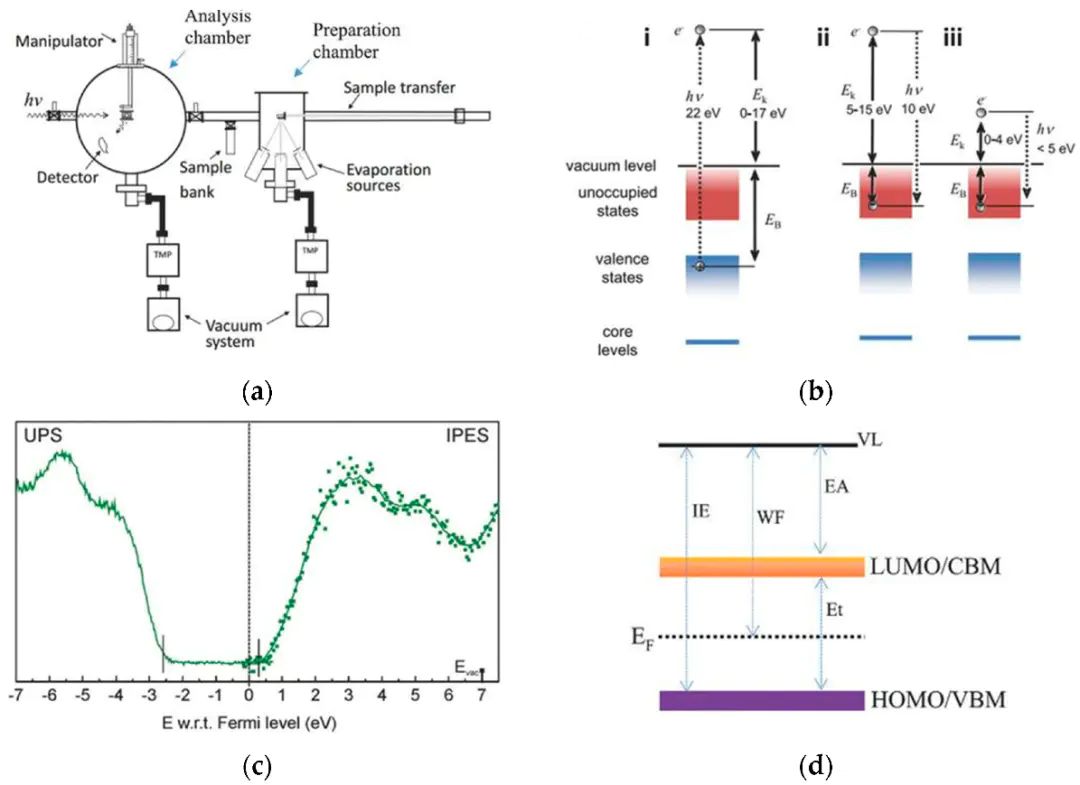 是一种极其强大的表面分析技术,可以直接测量材料的功函数和价带结构。通过测量二次电子截止边可以得到真空能级,再测量费米边的位置,二者之差即为费米能级相对于价带顶的位置也可以从UPS谱的价带谱区直接读出。