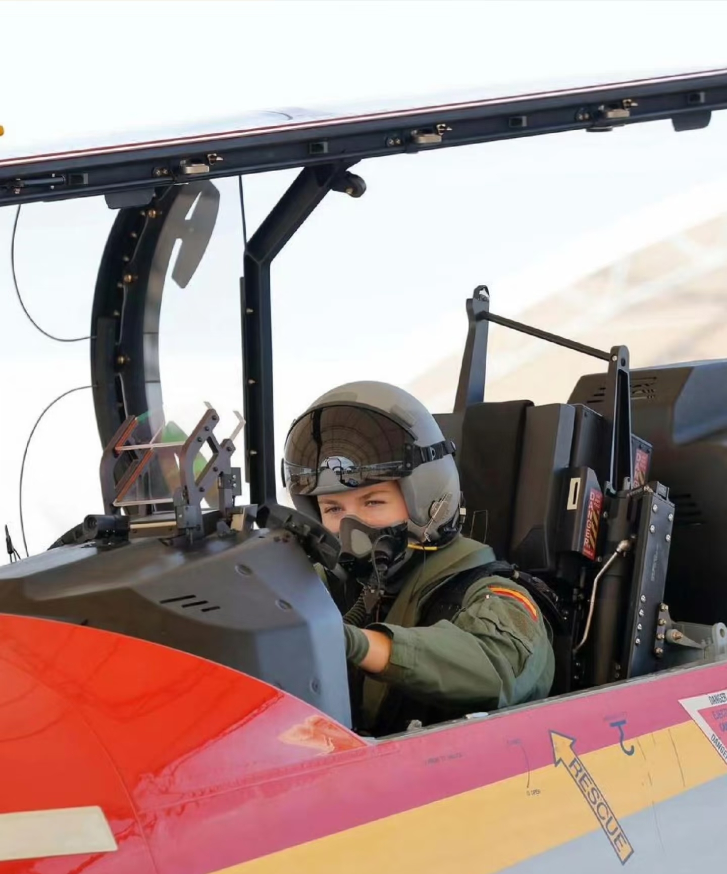 可以看到,莱昂诺尔公主穿着一套军绿色制服,金色的秀发扎成利落的麻花辫,一脸从容自信的登上了驾驶舱。