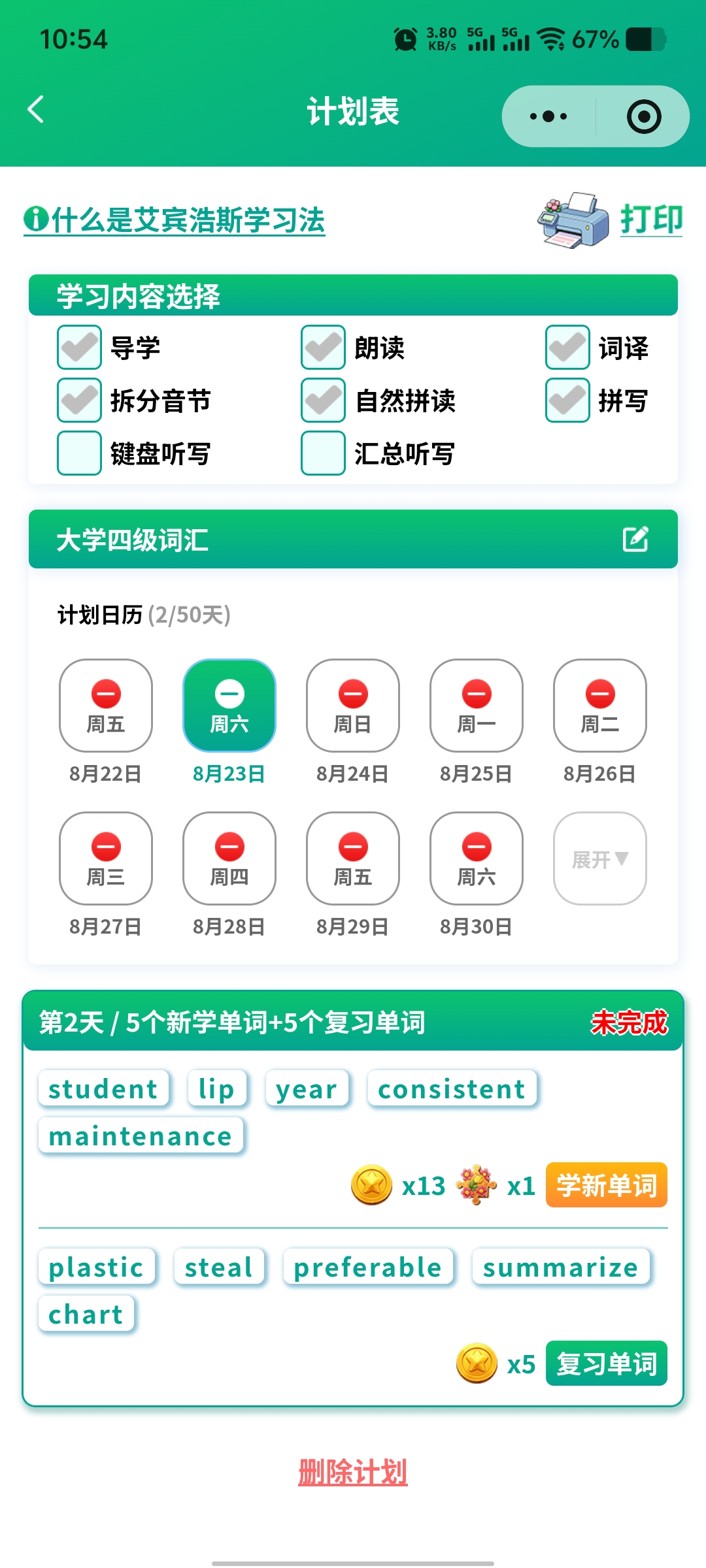 6.想自己安排内容也行,自定义学习内容及强度,它会按艾宾浩斯记忆法安排打卡。