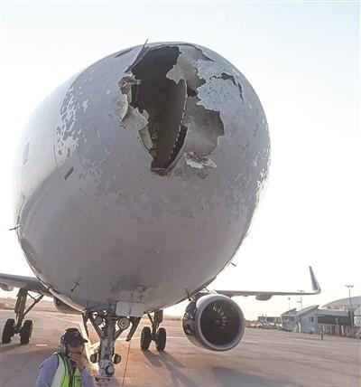 事情发生的突然又迅猛,印度客机机头当场被砸了个大洞。