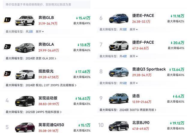现在啊,新能源SUV火得不行,传统燃油SUV市场那是受到了大冲击。为了不被挤出去,好多车型都使出了大招,直接大幅降价,就想把消费者拉过来!看看懂车帝那儿发的降价消息,燃油SUV又是一波猛降,降价超过10万的车型竟然有24款,高端SUV更是被“重点关照”了!说起来,降价最多的前八名,全都是豪华车。奔驰GLB冲在最前面,价格直接砍了一半,降了49%。揽胜极光、奔驰GLC、奥迪Q3这些,也都是40%以上的降幅。还有揽胜星脉、奥迪Q5L、沃尔沃XC60、宝马X1、凯迪拉克XT5和奔驰GLC轿跑这些豪车,降价都是10万以上!不只是豪车,那些主流合资SUV也没少降。途昂、途观L、本田CR-V、皓影、投影、锋兰达、奇骏这些,降价幅度也都是30%以上。这市场,真是太难了!燃油SUV降价潮汹涌,45款车型降价超过30%,连哈弗H6和CR-V都上榜了!