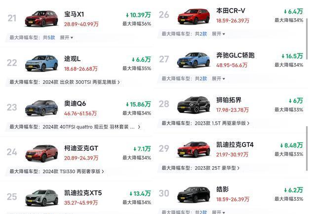 在热门合资SUV里头,也有不少车型上榜。大众家的途岳这次排到了第九,新车型优惠力度大,直接便宜了6.4万。途昂、途观L、本田CR-V、皓影、还有投影、锋兰达和奇骏这些车,优惠幅度都挺大,至少都打了七折。本田CR-V排在第26位,新车降价也是6.4万。再瞅瞅本田冠道,降价更多,大概7万,现在起售价都不到15万了。