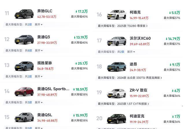 这次降价潮里,高端燃油SUV成了“降价大户”,超过20款车价格大跳水,直降10万多。就说奔驰GLB吧,现在买只要半价。奔驰GLA、揽胜极光、捷豹F-PACE这些,优惠力度都超过了四成。再看看那些热门的高端货,像奔驰GLC、奥迪Q5L、沃尔沃XC60、宝马X3、奔驰GLE,降价也都超过了10万。特别是路虎揽胜运动版,降了34万多,省下的钱都能再买辆奥迪Q5L了!就连入门级豪华SUV,像奥迪Q3、宝马X1、凯迪拉克XT5这些,也降了10万多,现在起售价不到20万了。