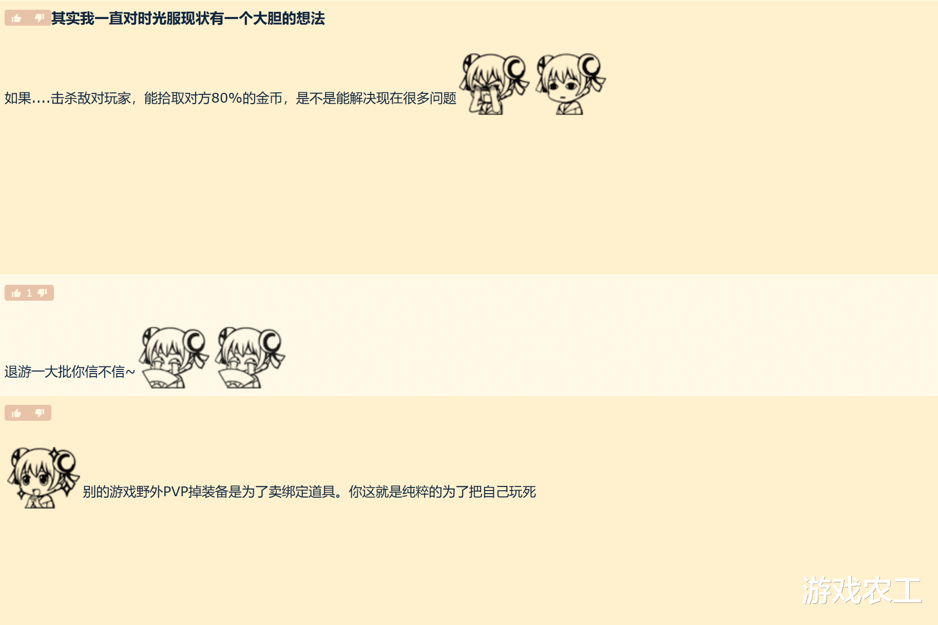 那么该帖主提议了什么呢?该帖主表示针对时光服目前有一个大胆的想法,就是击败玩家后,能够拾取对方80%的金币,这样的话是不是能解决很多问题?农工觉得该玩家提议本身是为了解决两个问题,一个是普通玩家金币不够,另一个想解决的问题在于PVP活跃度不够的问题,所以通过金币转移的形式来激发玩家们的活跃度。