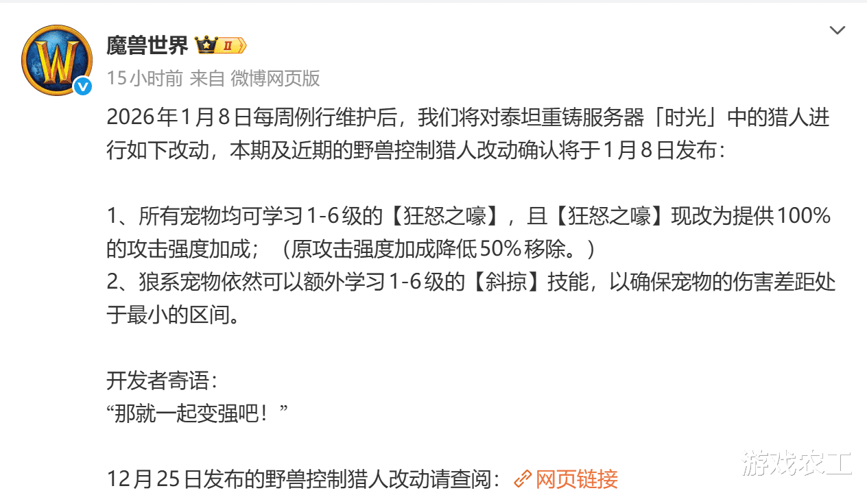 先说一个题外话,前两天雷火不是对魔兽世界时光服中的猎人进行优化了吗,尤其是针对狼系宠物进行了优化,而核心优化点是雨露均沾,给每个角色都加上狂怒之嚎,并且对狂怒之嚎进行削弱。但是很多玩家都有意见,如今雷火取消了狂怒之嚎的削弱,直接保留满血狂怒之嚎。既然如此那就一起变强吧,所以雷火还是挺听劝的。