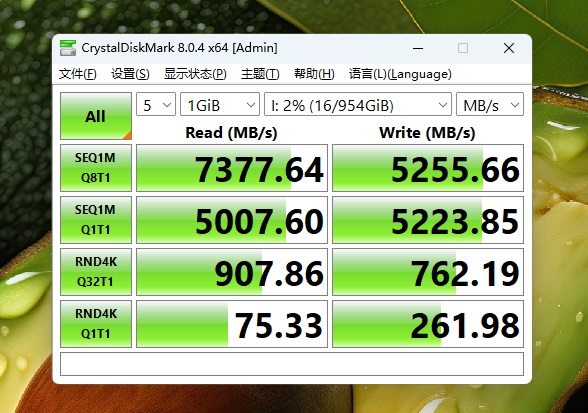 在经典的CrystalDiskMark测试中,奥睿科IG740的顺序读取速度最大可达7377.64MB/s,写入速度最大5255.66MB/s,达到PCIe 4.0 x4满血前列水准。