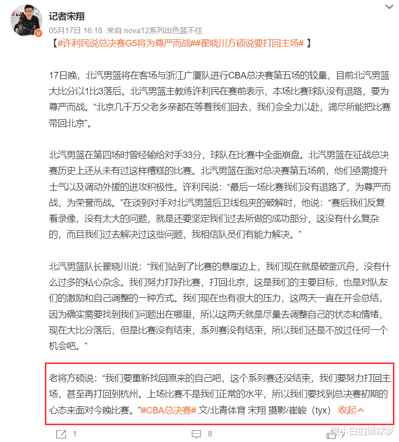 还记得G4时许利民质问方硕吗?双方在替补席爆发巨大的矛盾,甚至一度有记者说许利民失去了对更衣室的控制,如今看来是不是许利民才是人间清醒?他给了方硕机会但不中用,可G5他还是愿意给球队的元老一次机会,方硕再一次搞砸。