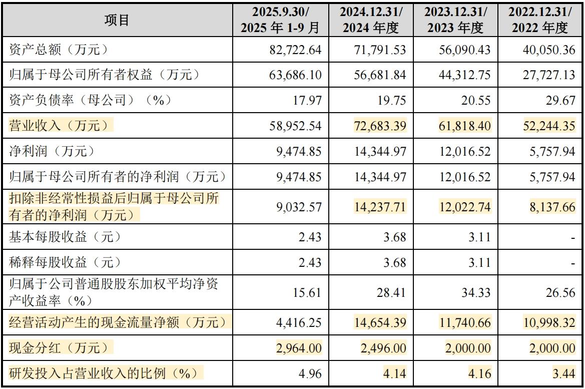 2022年至2024年分别实现营业收入5.22亿元、6.18亿元和7.27亿元,年均复合增长率17.95%;扣非后归母净利润分别为0.81亿、1.20亿和1.42亿元,年均复合增长率达32.27%。