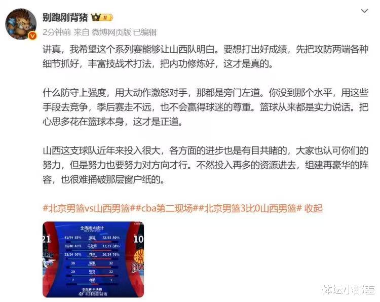 媒体人别跑刚背猪点评了山西男篮的发挥,他认为这个系列赛结束之后,山西队应该要明白,想要拿到好成绩,就得先把攻防两端各种细节抓好,丰富技战术打法,把内功修炼好,这才是真的。至于防守上强度,用大动作激怒对手,那都是旁门左道;如果没有达到相应的水准,用这些手段去竞争,只会让季后赛无法走得更远,更不会赢得球迷们的尊重。把心思花在篮球本身,这才是正道。