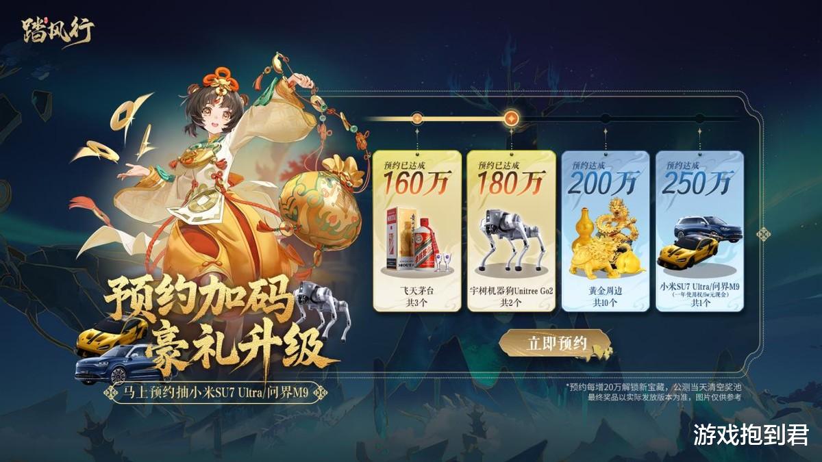 同时,官方还宣布预约奖励再次升级加码。《踏风行》手游官网开启“砍一刀”活动,与好友结伴预约进度达100%可免费获得绝品古宝,排名前列者还能获得飞天茅台、随心飞等好礼。官网预约人数达到不同阶段,还将解锁飞天茅台、宇树机器人、黄金周边和小米su7ultra/问界一年使用权等丰厚奖励。公测首日更是会送100抽,首周送390抽,多日登录更有极品器灵、绝品载具等海量好礼!《踏风行》这福利很难让人不心动啊!