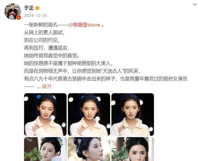 于正也在微博上发文表示,张婉莹的古装扮相确实很漂亮,但表演还需要时间沉淀。