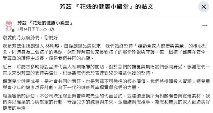 随后,芳兹的创办人林明璇发表正式声明,再次表达了对儿少权益保护的重视,并解释了终止与曾国城合作的原因。