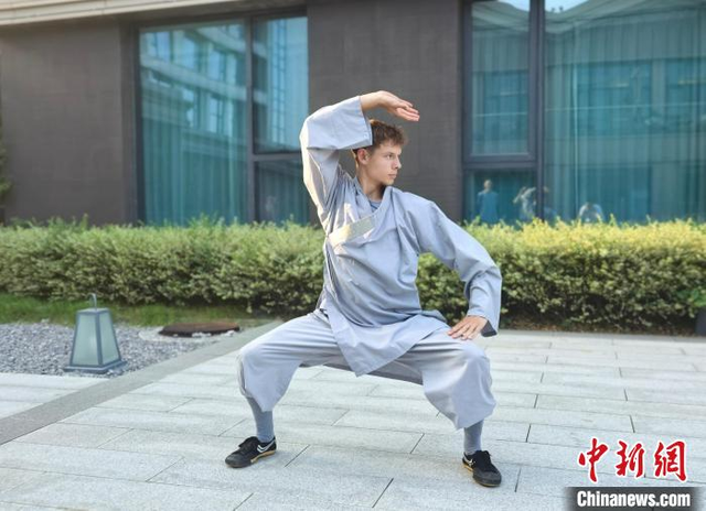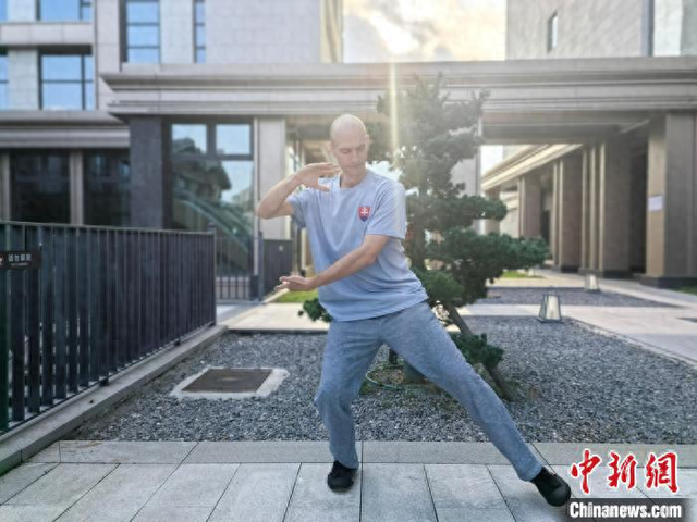 ▲8月14日,河南登封,外国青年山姆在住地展示功夫。 中新社记者 阚力 摄