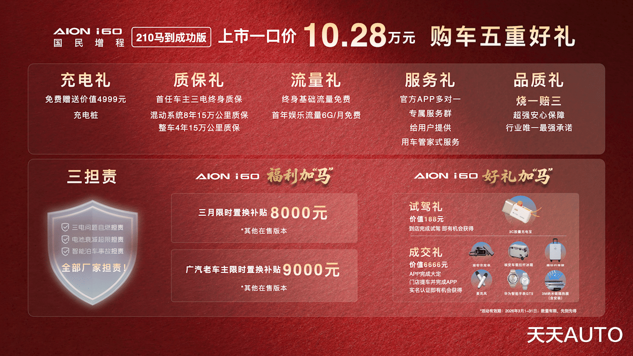 埃安i60马到成功版的推出,把这一逻辑推向了极致。10.28万的售价,配上210km纯电续航、1240km综合续航、3C快充、五连杆后悬、弹匣电池......这些两年前还是20万级“豪华套餐”的配置,如今被埃安做成了国民标配。而埃安i60其他在售版本,也同步加码了权益,3月份限时置换补贴8000元,广汽老车主更是高达9000元,诚意十足。