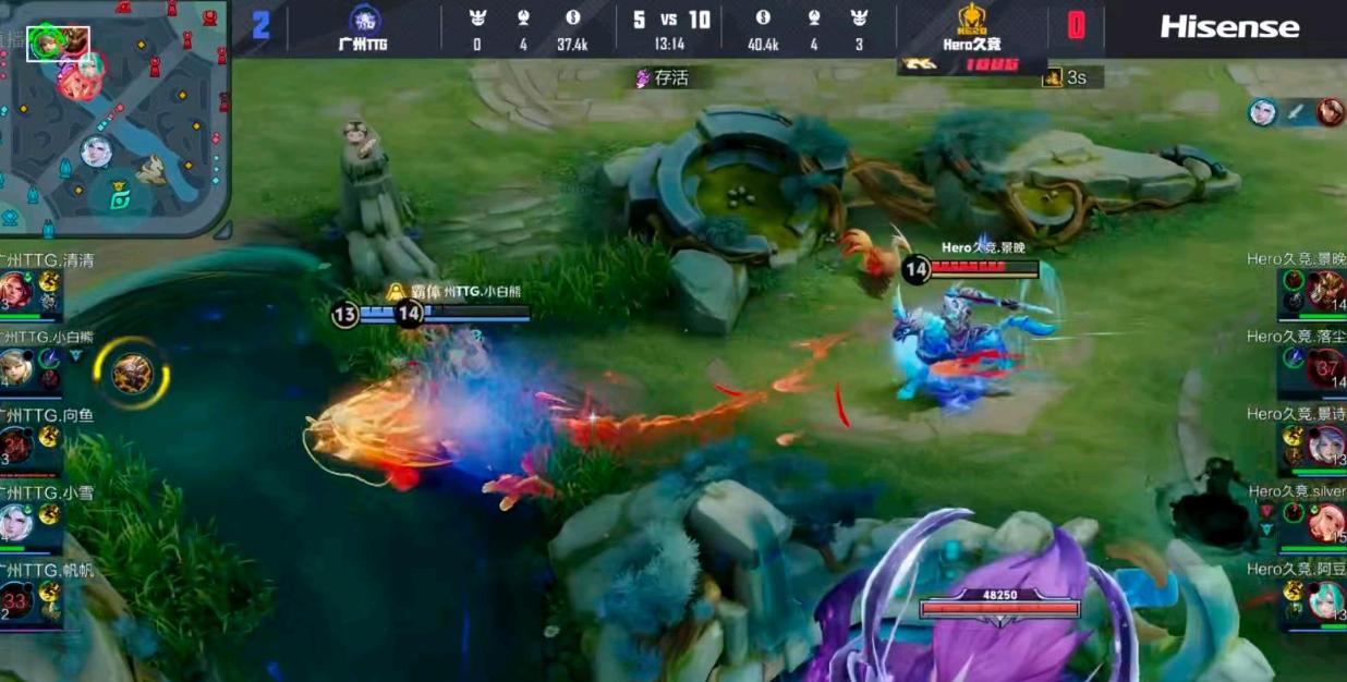 第五局hero抓了一波小白熊,但是TTG并没有退,清清的马超侧面进场,先是击杀了戈娅。接着带走了残血的孙策,本来hero是可以撤的,但景诗的火舞大闪想打苍被小雪闪现躲了,清清再次进场把火舞收掉,再击杀桑启,本以为清清要五杀了,但最后一个人头被小雪K掉,实在是有点遗憾,