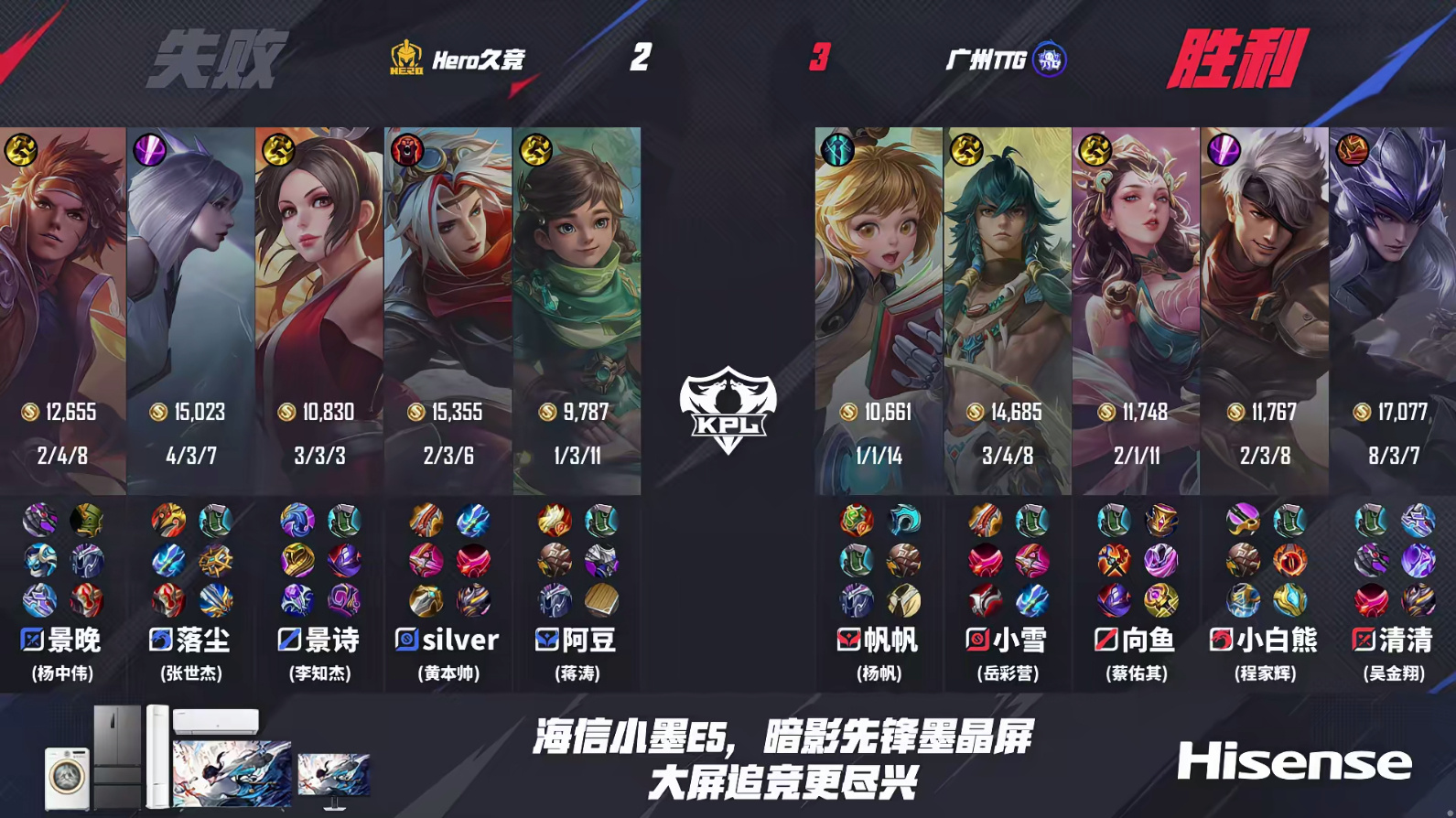 刚抢了五杀的小雪就被hero抓了一波掉点,孙策和镜一起进场切死小雪。TTG其他人主要能被撤退但是已经被hero包围,直接被打了一波团灭,孙策和戈娅都拿到了双杀。最后一波落尘的镜蹲草想切苍,小雪闪现拉开。孙策开船撞过来被夏侯惇挡住,戈娅在旁边平A键已经快点冒烟了,但是实在是打不动。清清的马超还在游龙,最终TTG一波团灭hero,3-2拿下比赛。