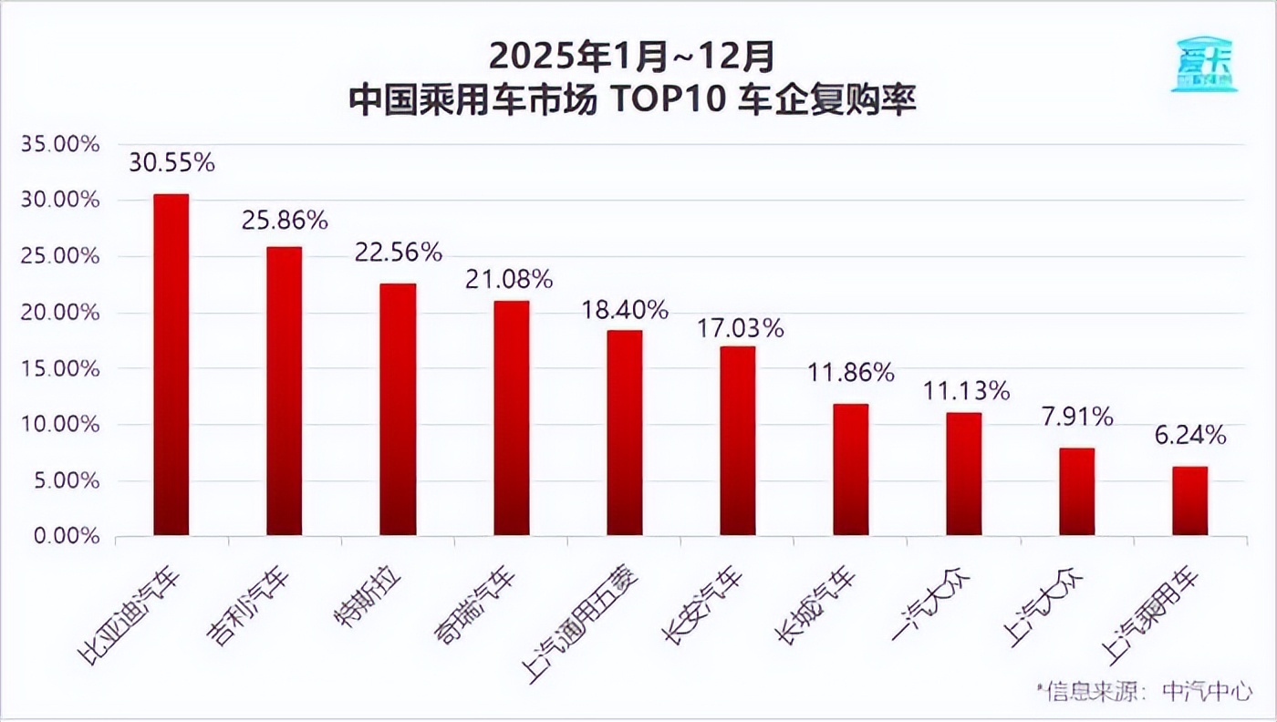 《2025年车企复购率榜单》显示,比亚迪老车主复购率达30.55%,位居第一,大幅超越传统主流车企。