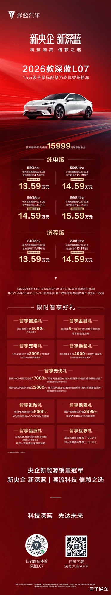 8月13日,15万级唯一全系标配华为乾崑智驾轿车——2026款深蓝L07焕新上市,共推出6个版本,售价区间为13.59-15.59万元。新车不仅全系标配华为乾崑智驾ADS SE,还采用进化升级的深蓝超级增程2.0,并凭借科技美学、新智舱、新驾乘等全维越级实力,成为新能源轿车市场的新焦点。