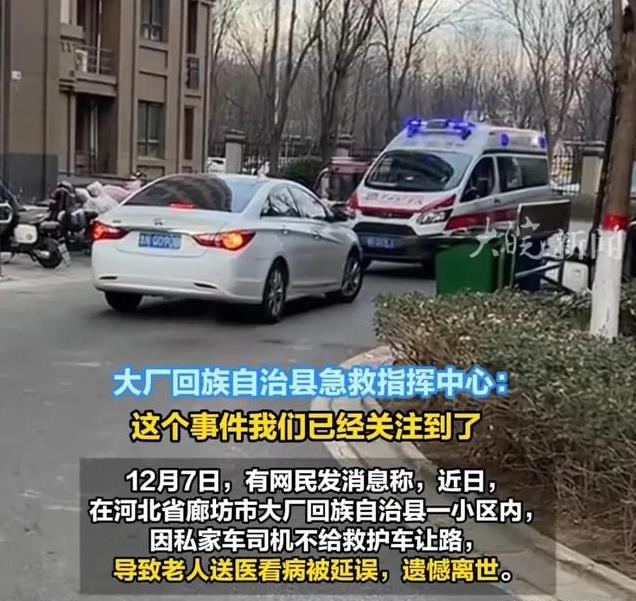 2024年12月6日早上7点左右,在河北廊坊某处小区路口,画面中有一辆白色的小轿车,而另一边是正在抢救病人的救护车,救护车车上还有一位需要急救的老人。