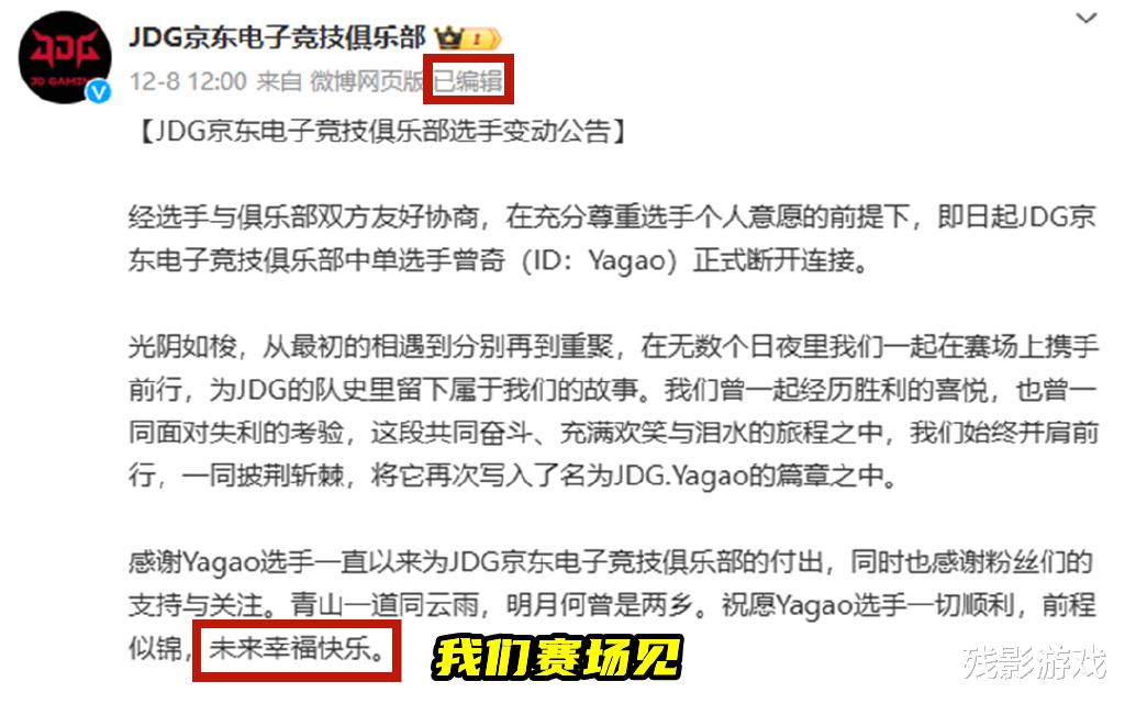 很明显,膏子哥的这一波离队是直接选择退役了,并且他的退役还伴随着退圈。毕竟对于职业选手而言,退役之后的最好出路就是直播,只要是高流量选手,直播时的收益并不会比比赛要低,偶尔接点商业活动,也能好好的赚一笔。但牙膏却表示自己不会直播,后续只想过普通人的生活,到处去旅旅游享受生活。这一消息出现后,JDG也是修改了他们的官宣消息,将“我们赛场见”,改成了“未来幸福快乐”。