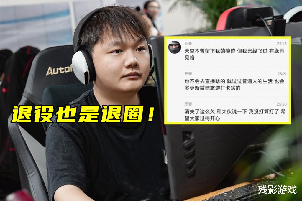 就好比Mark、大黄,这两位曾经也是顶级战队的一员,如今却找不到队伍。而牙膏更是悲惨,上个赛季还是和Knight一样能拿到大合同的中单强手,这个赛季却“没人要”了。在JDG的第一版官宣中,他们官宣了牙膏的离开,并且在最后留言“我们赛场见”!然而在牙膏的粉丝群里,他却告知自己的粉丝:消失了这么久,和大伙说一下,没打算打了,也不会去直播,就过过普通人的生活,会多更新旅游打卡。