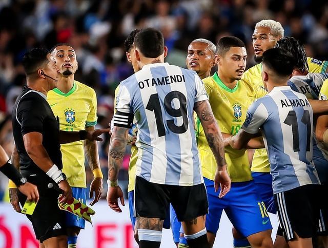 半场比赛中,两队竞争激烈,拼抢频繁犯规,多次发生冲突对峙,并伴有言语攻击。拉菲尼亚赛前豪言要击败阿根廷,而奥塔门迪则以手势示意其安静。
