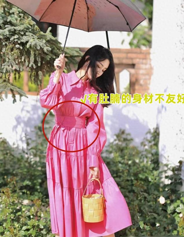 肚子大的人往往有一个相对较瘦的小腰,所以可以凭借这一优势挑选一些收腰设计且下摆略微松垮一点儿,上身部分略松垮且遮肚子的版型进行搭配,这样不仅能够非常好地起到遮肉作用,还能突出“瘦腰”的优点哦。