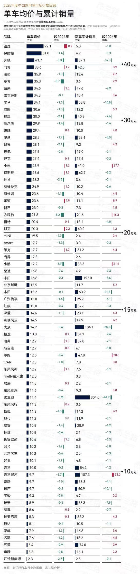 近日,杰兰路发布《2025年乘用车品牌单车成交均价与销售额报告》,报告显示,2025年问界单车成交均价达38.6万元,位列新势力品牌成交均价第一名;同时,全年累计销量超42万辆。成交均价与销量连续两年实现增长,形成“量价双升”昂扬曲线,反映出问界“智慧重塑豪华”的品牌理念与长期价值已获得市场广泛认可。