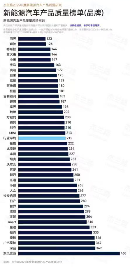 这份对质量的坚守,也获得了权威机构的认可,在杰兰路《2025年度新能源汽车产品质量研究报告》中,问界荣登新能源汽车产品质量榜单(品牌)第一,其旗下车型问界M9、问界M8、问界M7更在新能源汽车产品质量榜单(车型)中包揽中大型及以上SUV车型前三名。