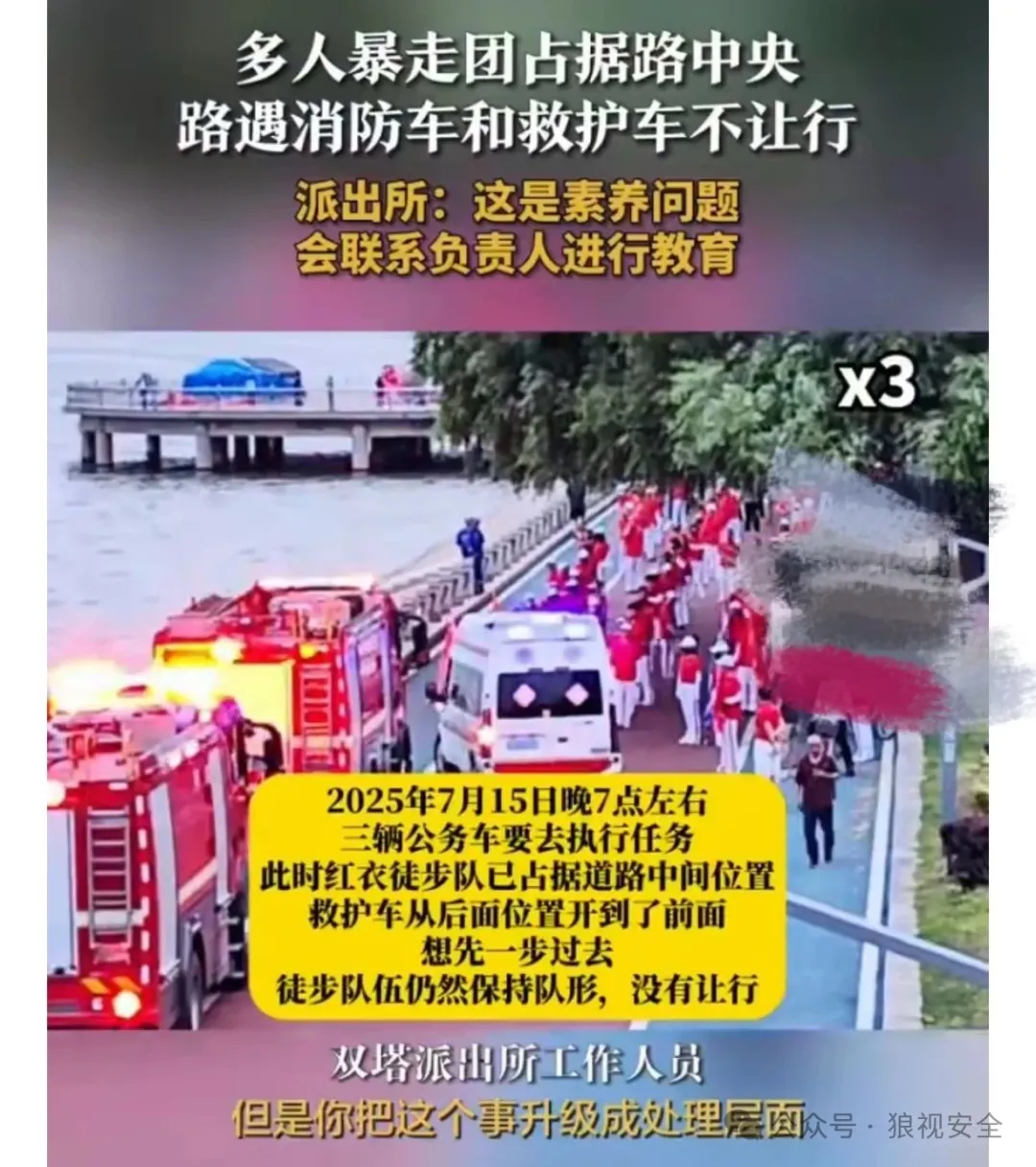 近日,辽宁朝阳的一个老年“暴走团”面对3辆执行任务的消防车、救护车组成的车队拒不让路,双方对峙数分钟,最终“暴走团”获胜,消防车救护车被迫向“暴走团”让路。