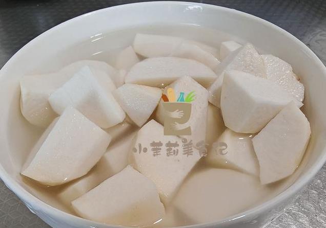 1、挑选完好无损,且掂起来较轻的小芋头带回家,削掉外皮,进一步冲干净,改刀为大块,浸没在水中。