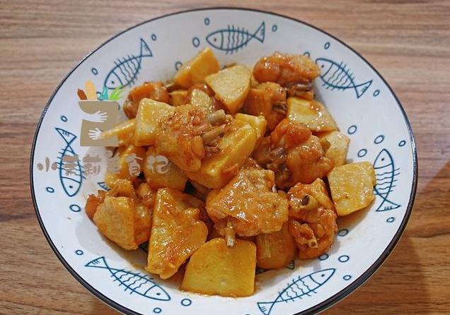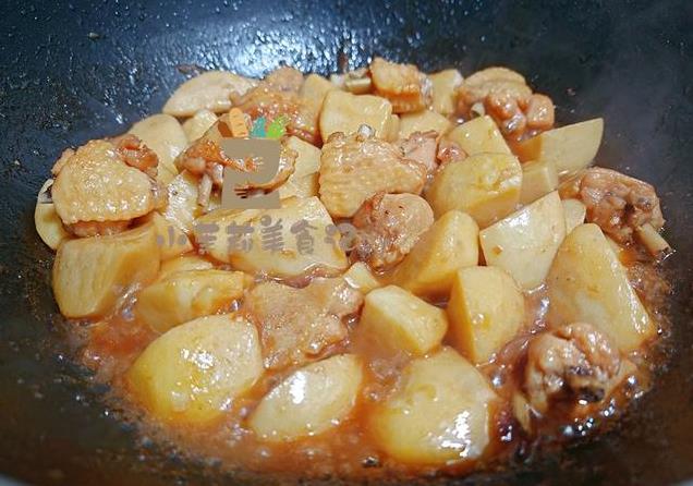 4、芋头倒进去,加生抽,蚝油,同鸡翅炒匀,淋上一碗开水,焖半个钟头,之后补盐,大火炒一炒,收紧汤汁后出锅。
