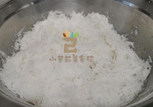 2、白萝卜一整根,洗净去皮之后,分成小块,逐一擦成细丝。很快会有水分析出来,直接装进纱布中攥干。
