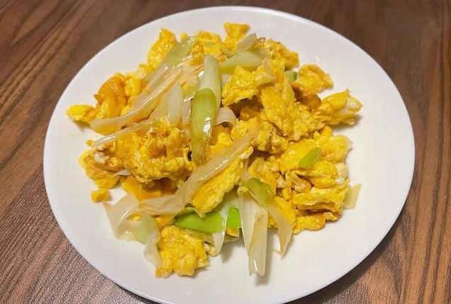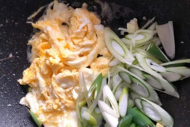 4、鸡蛋扒拉到一旁,放入大葱,调盐,生抽少许,快速炒至塌生,再与鸡蛋炒匀,快速出锅装盘。