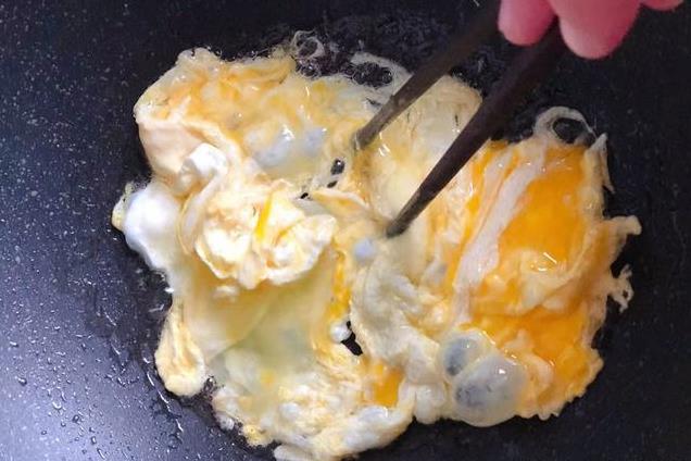 3、锅中放油烧热,先来炒鸡蛋,直到其彻底凝固成形。