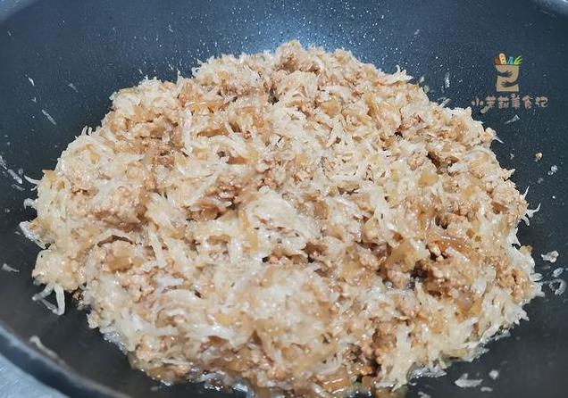 5、最后将萝卜丝放进去,先抓散,接着再用筷子搅拌,酌情放点盐,调好味道即可。