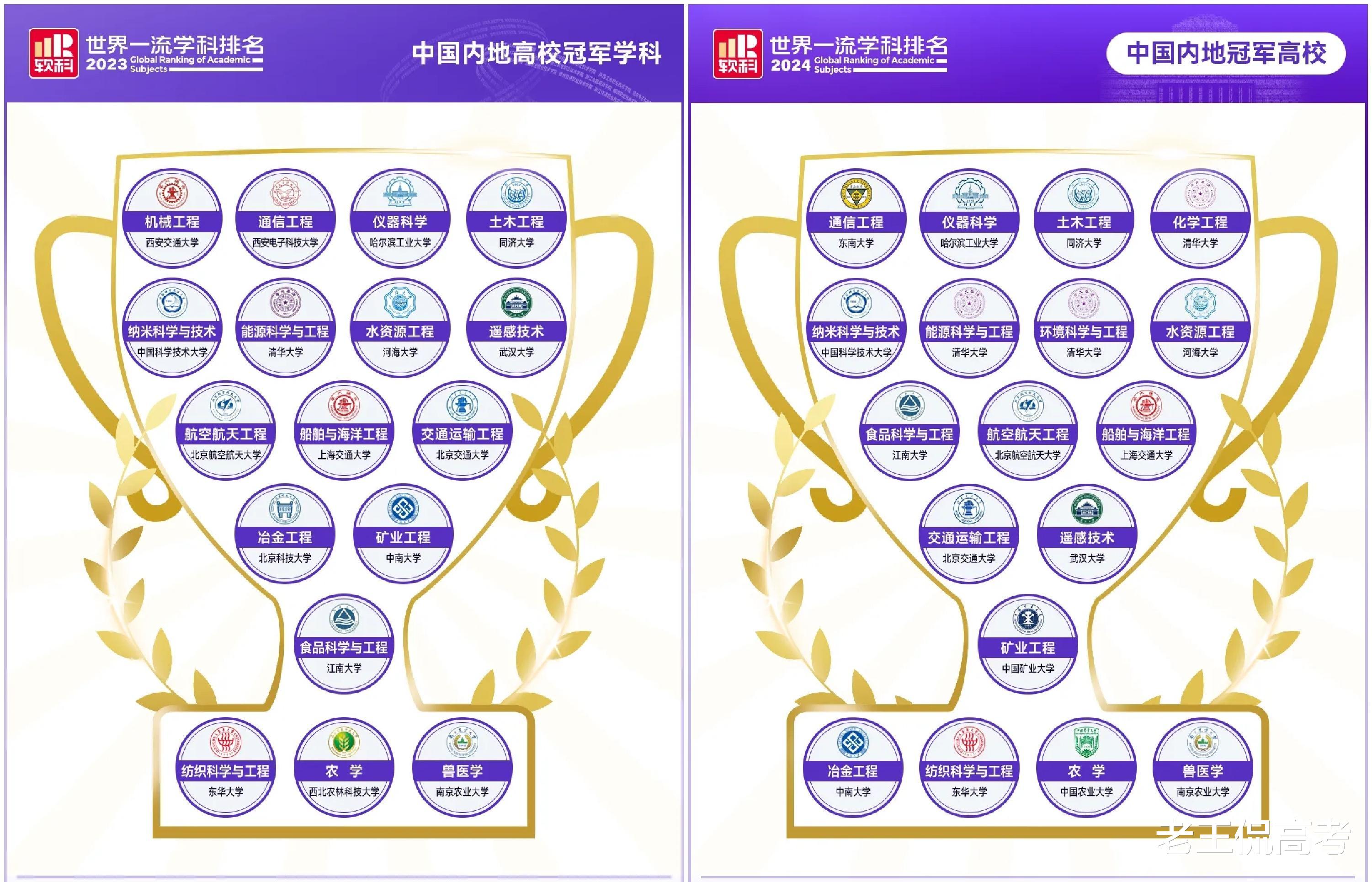 除了冠军学科的增减外,还有4个冠军学科的获得者换了学校,分别是通信工程、冶金工程、矿业工程和农学。