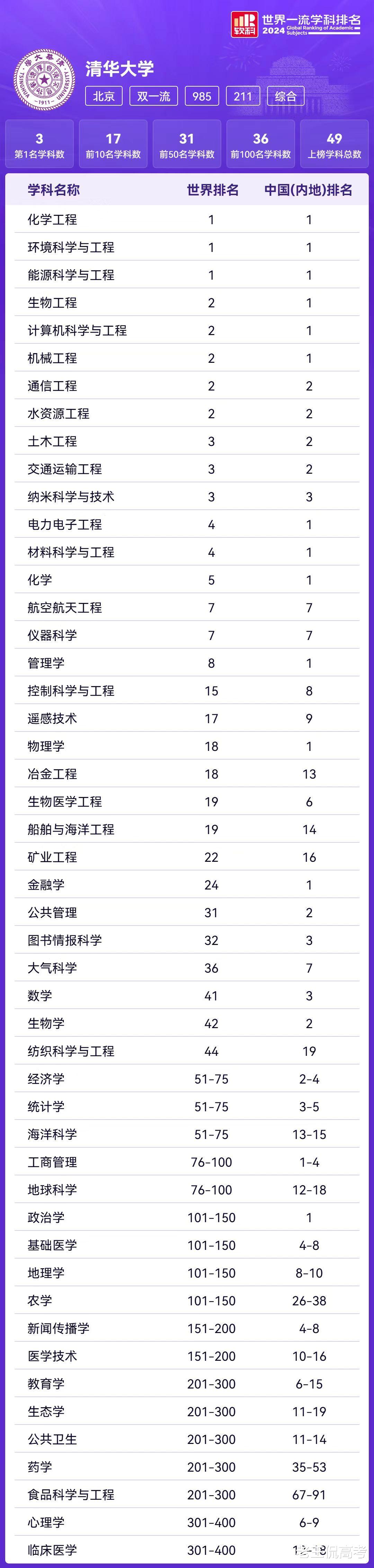 此次我们一共新增了“化学工程”和“环境科学与工程”2个冠军学科,获得者都是清华大学。清华大学在这份榜单上的表现也确实无愧于国内第一工科强校的称号,除了这两个学科外,它还获得了“能源科学与工程”学科的冠军。在国内高校获得的18个冠军学科中,独占了3个学科,也是国内高校中唯一获得1个以上冠军学科的。而除了冠军学科外,清华大学还获得了17个世界排名前十的学科,这个数量位列世界第4,仅排在哈佛大学(24个)、斯坦福大学(19个)和麻省理工学院(18个)之下。