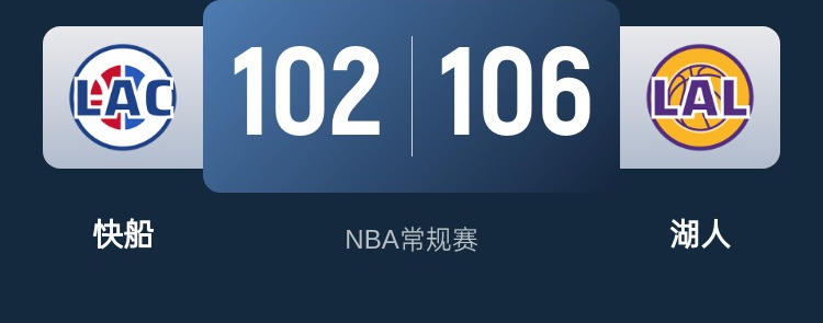 比赛开始,小卡接连三分带队打出8-2开局,哈登里突外投领先到10分,里夫斯三分止血后因小腿酸痛不回归,詹姆斯和东契奇接连三分咬住比分,首节快船仅领先1分,次节詹姆斯接连突破带队反超比分,克内克特连续两记三分助湖人拉开比分,邓恩联手哈登3记三分帮助快船半场追到差5分。下半场,湖人接连失误,邓恩连续抢断帮助快船打成反击一度反超比分,东契奇连续突破稳住局势但领到4犯,三节湖人还领先6分,末节祖巴茨接连内线强打助快船咬住比分,东契奇关键三分又稳住优势,哈登连续失误后接连空位三分不中,湖人始终保持两球以上领先,快船连续关键挑战成功,但小卡和博格丹连续三分不中,最终湖人106-102击退快船,拿到5连胜。