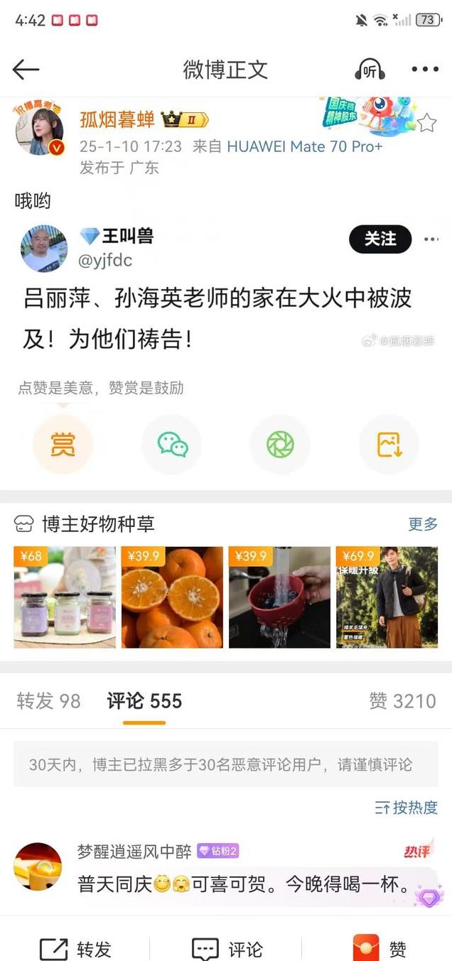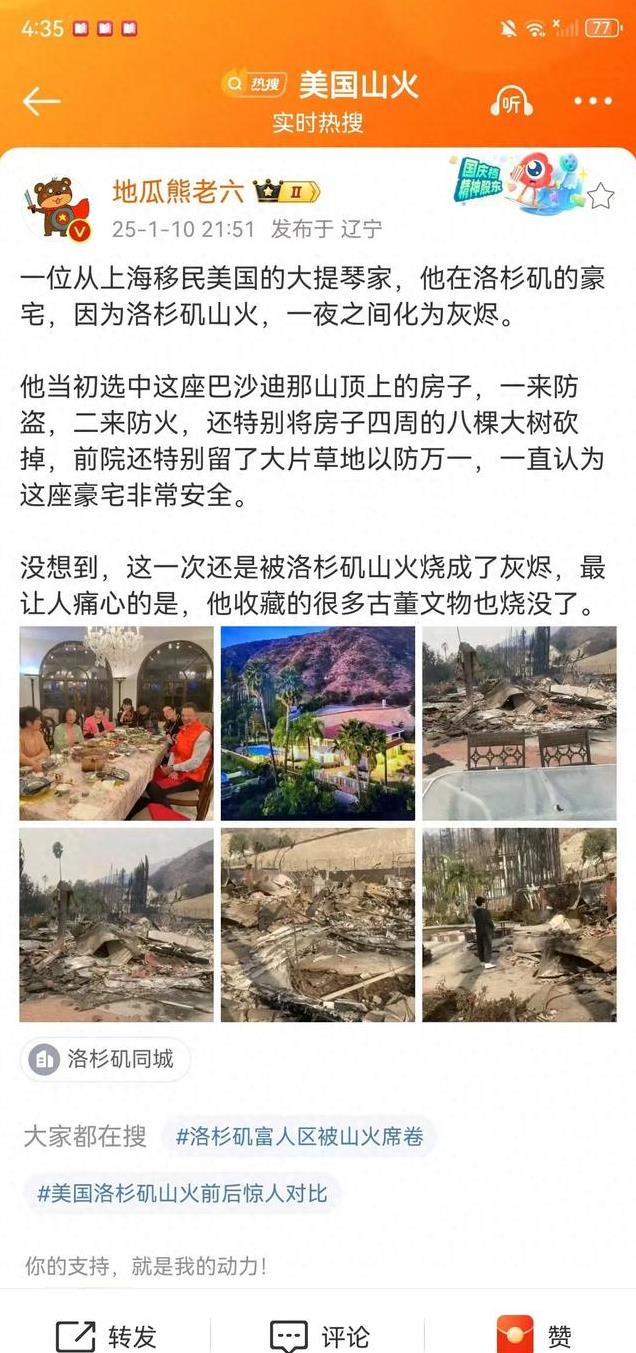 更精彩的是,灾情里总有“润”到美国的人出现,成了调侃的重点目标。就像那个移民美国的大提琴家,山火让他的豪宅烧没了。有些人立刻跳出来冷嘲热讽:“看吧,润到美国就得面对这种命运!”不过可能因为这位大提琴家不够有名,讨论没激起来。而孙海英夫妇的“受灾传闻”却瞬间引爆了网络。有人说他们的房产被波及,有人发出“哦哟”两字,评论区里顿时充满了“喜气洋洋”的庆祝氛围。虽然消息真假未明,但这并不妨碍网友们狂欢一波。