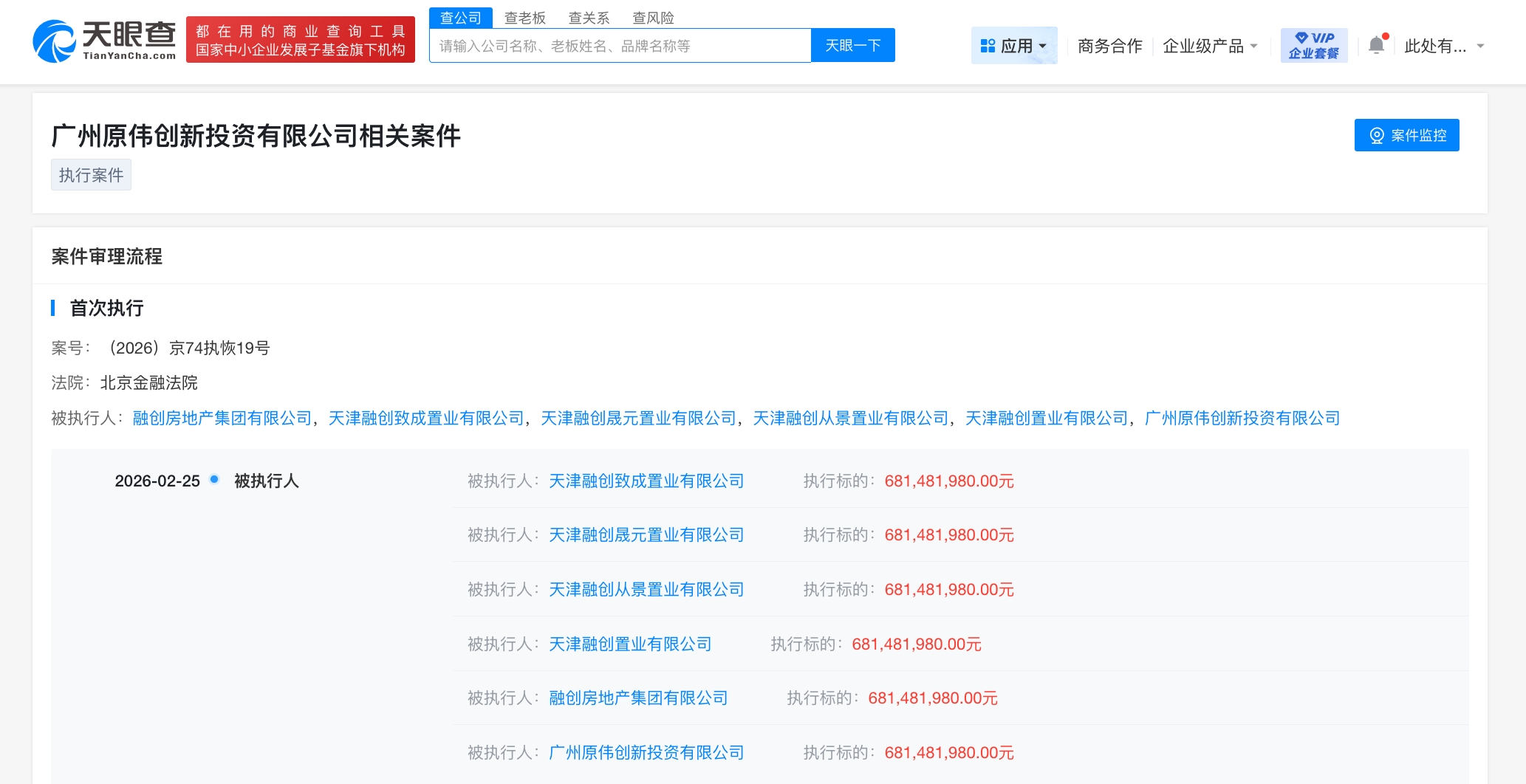 天眼查法律诉讼信息显示,2月25日,融创房地产集团有限公司新增2条被执行人信息,执行标的合计6.8亿余元,被执行人还包括天津融创致成置业有限公司、天津融创晟元置业有限公司等,执行法院为北京金融法院、昆明市官渡区人民法院。
