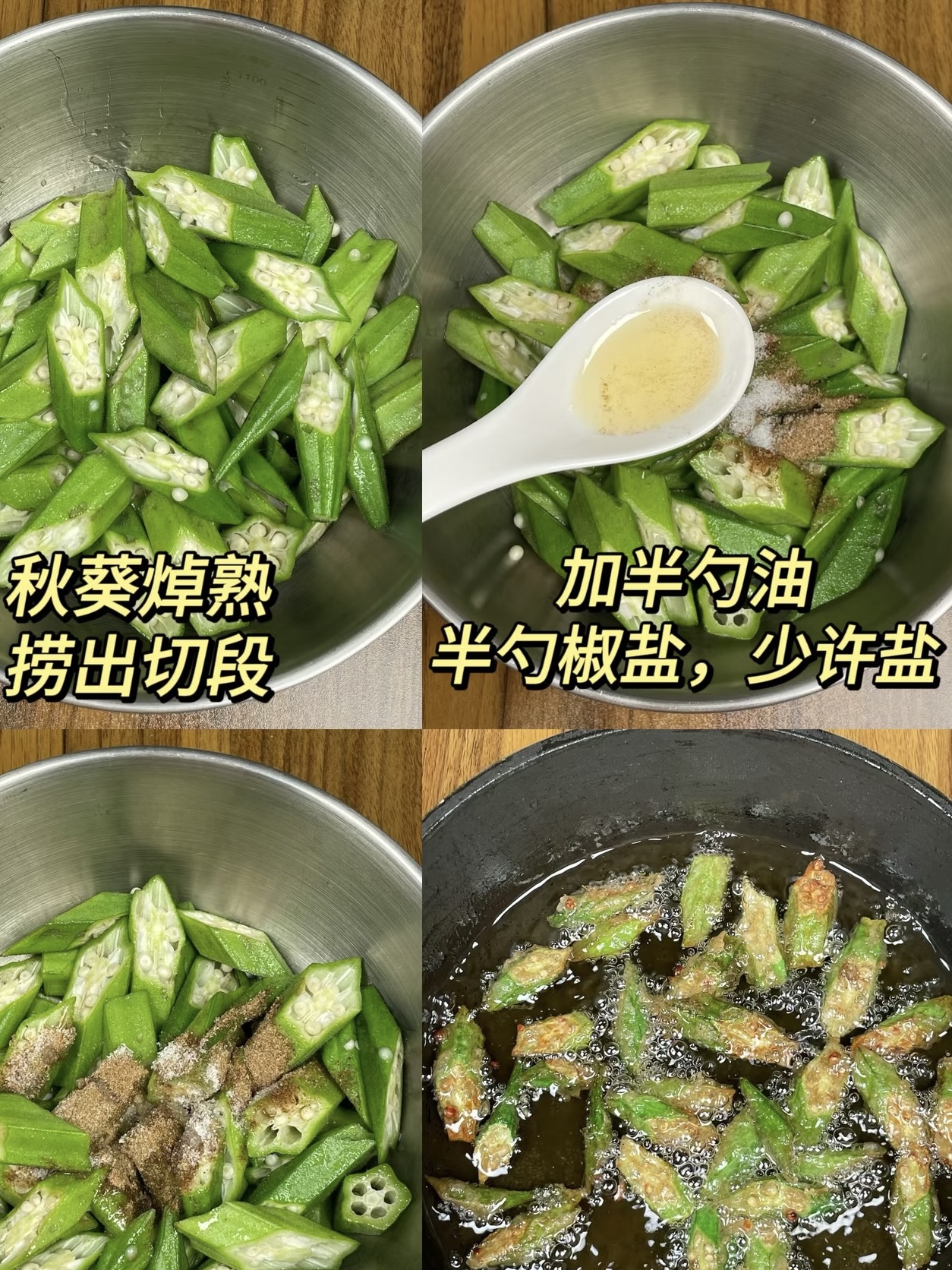 ① 秋葵一定要挤干水分,否则粉挂不住,煎时“噼啪”爆油。② 椒盐一定要趁热撒,香味才能被“烫”出来。③ 现做现吃,放久回软,180℃回烤3分钟,立刻恢复“咔嗞”感。
